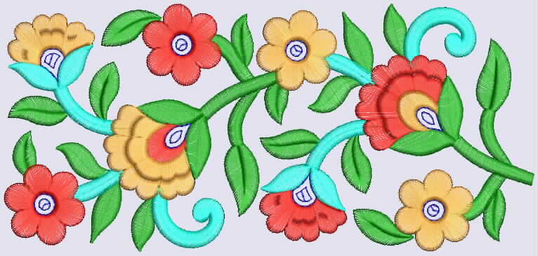 It is a fantastic floral figure embroidery design for lace border with eye Cathy red and green color combination. You can do some classy mirror and stone work in it then its perfectly suitable for short and maxi dresses for parties and events. This design is attachable with home interior stuff like to design bed sheets, sofa or T.V cover and In business of jewelry designing too to make different type of ornaments.